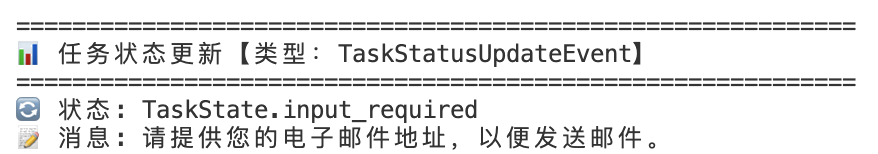 接着Agent运行,但是这个任务需要补充信息,此时会发送一个状态为input-required的TaskSatusUpdateEvent事件: