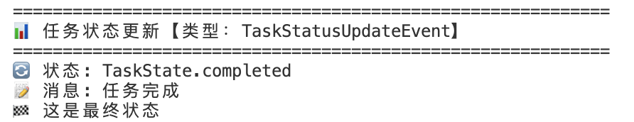 最后,服务端可以再次推送状态为“completed”的TaskStatusUpdateEvent给客户端,表示任务已经结束,将关闭SSE连接。
